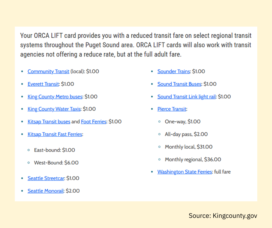 At Ballard Food Bank we believe that our neighbors deserve access to food, housing, healthcare AND affordable local transit! One of our Hub Partners - ORCA Lift - understands how foundational transit is in the ecosystem of services that our neighbors rely on. ORCA Lift helps neighbors get the most out of our regional transit systems through a reduced fare card. In other words, if you qualify for an ORCA Lift card you can get onto your choice of transit by only paying $1 in most cases!